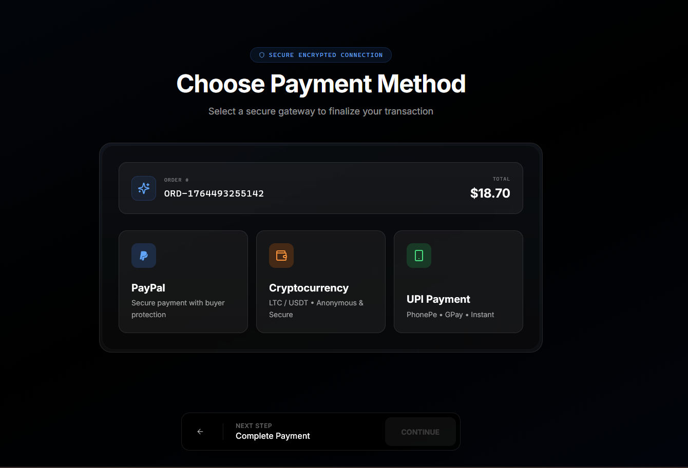 PayPal: Pay using your PayPal balance, linked bank account, or credit/debit card through PayPal. Available worldwide where PayPal operates. UPI: Available for customers in India. Pay using any UPI-enabled app such as Google Pay, PhonePe, Paytm, or others. Cryptocurrency: Pay with Litecoin (LTC). Requires a cryptocurrency wallet. Select your preferred method and click Continue to proceed to the payment page.Step 5: Complete payment