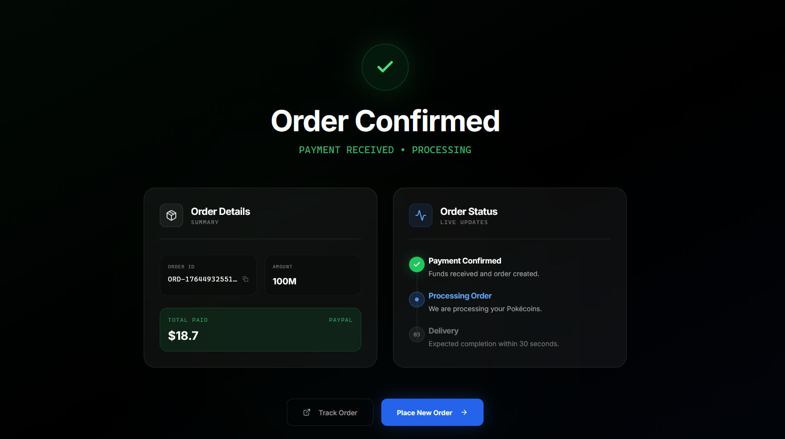 Your order is complete. Check your DMs from poketwo about a market purchase if its an instant order, or wait till the delivery date for pre orders.