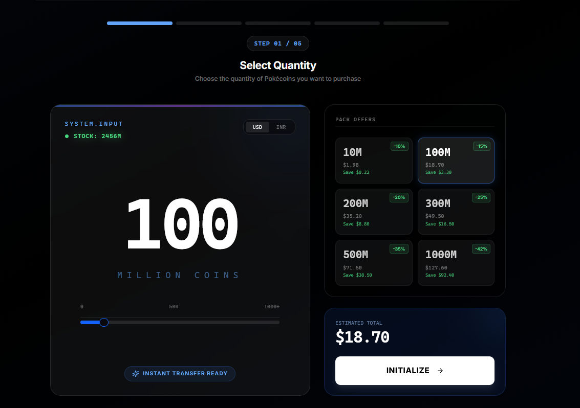 As you adjust the quantity, the price updates in real-time. The display shows:- Price per million Pokecoins at your selected quantity