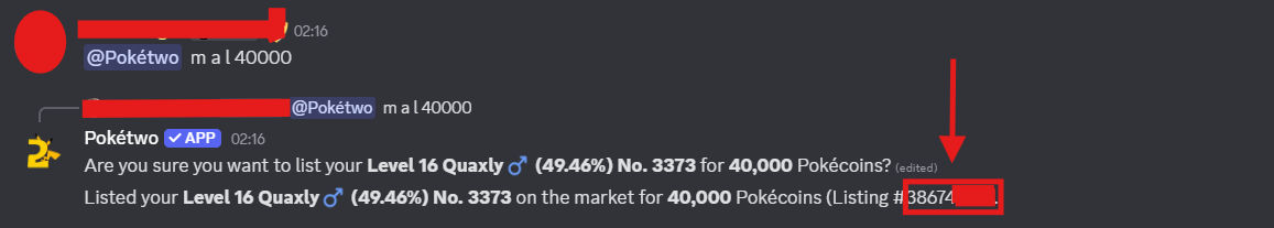 @Poketwo m a <ID of a random pokemon in your inventory> <amount of pokecoins of a market id>. For example,@poketwo m a 4543 50000000. - Click the confirm button sent by poketwo.
