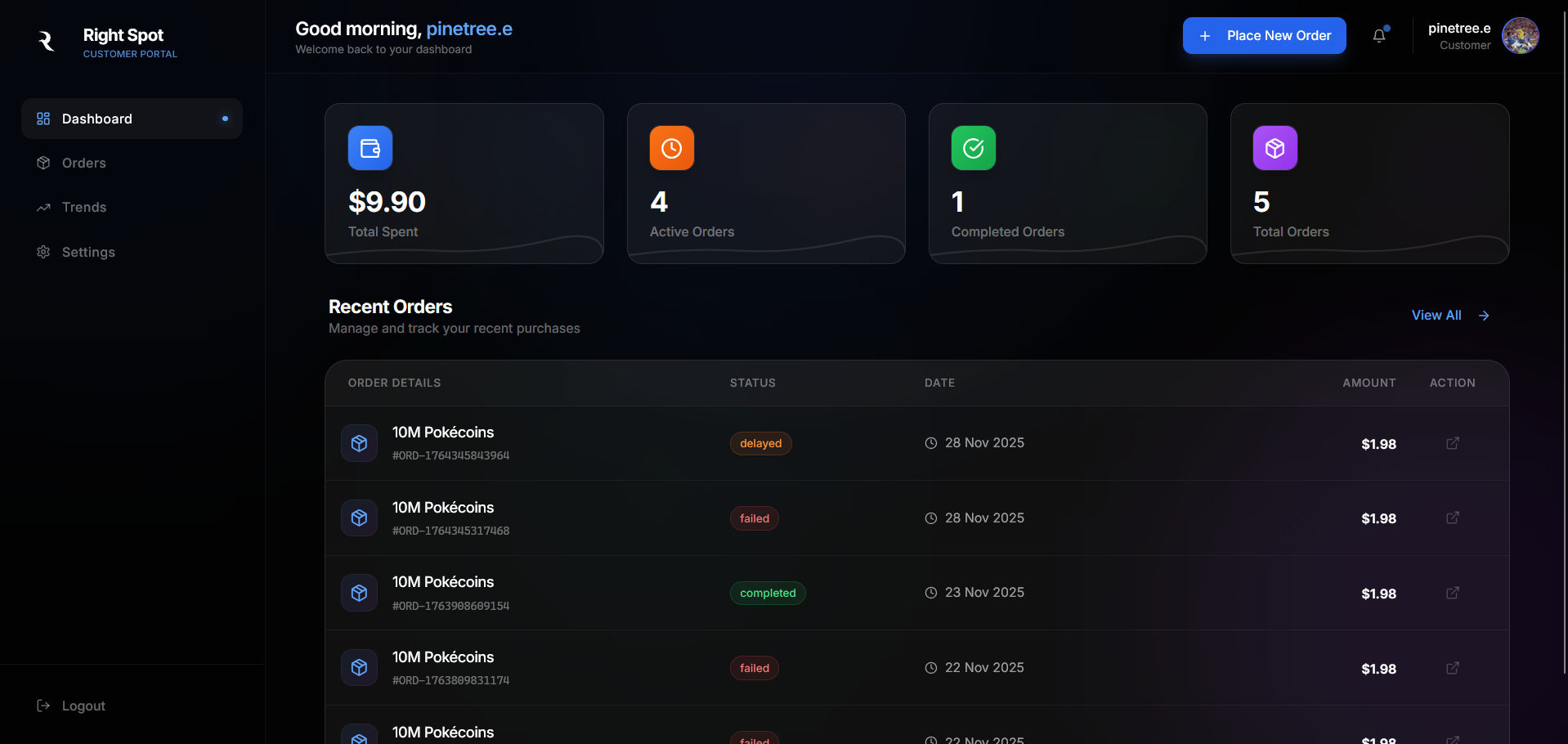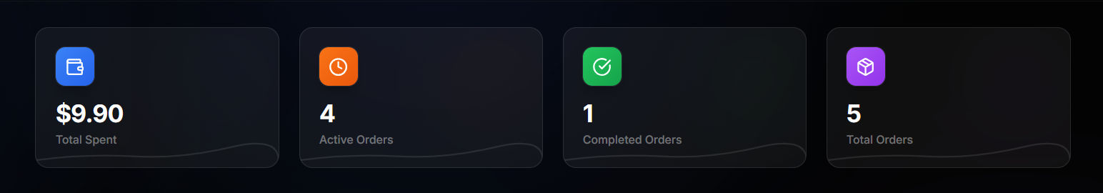 - Total orders: This card shows the total number of orders you have placed since creating your account. This includes all order types—instant orders, pre-orders, completed, and pending.