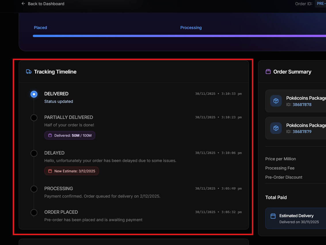 Each order has a tracking timeline that shows all status updates with timestamps and messages. Special updates like partial deliveries and delays include additional information:- Partial delivery: Shows amount delivered vs total